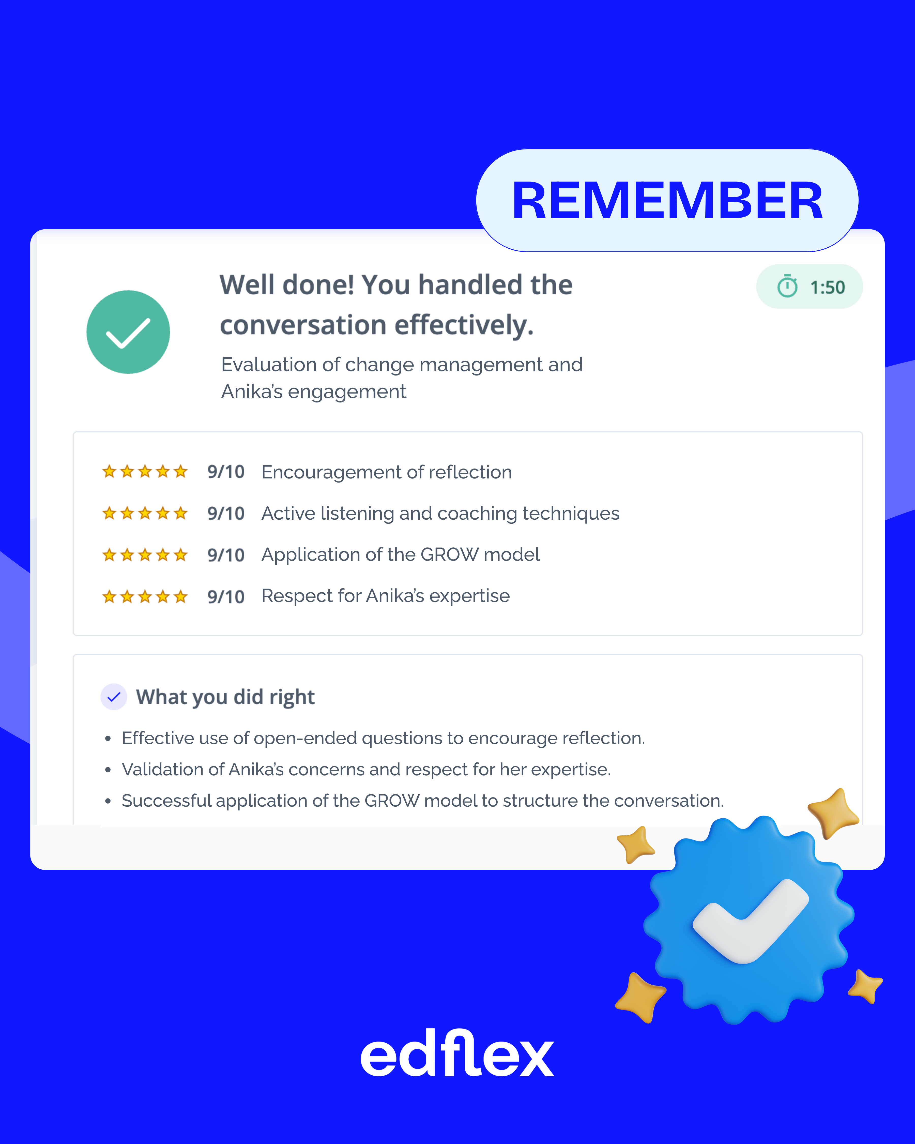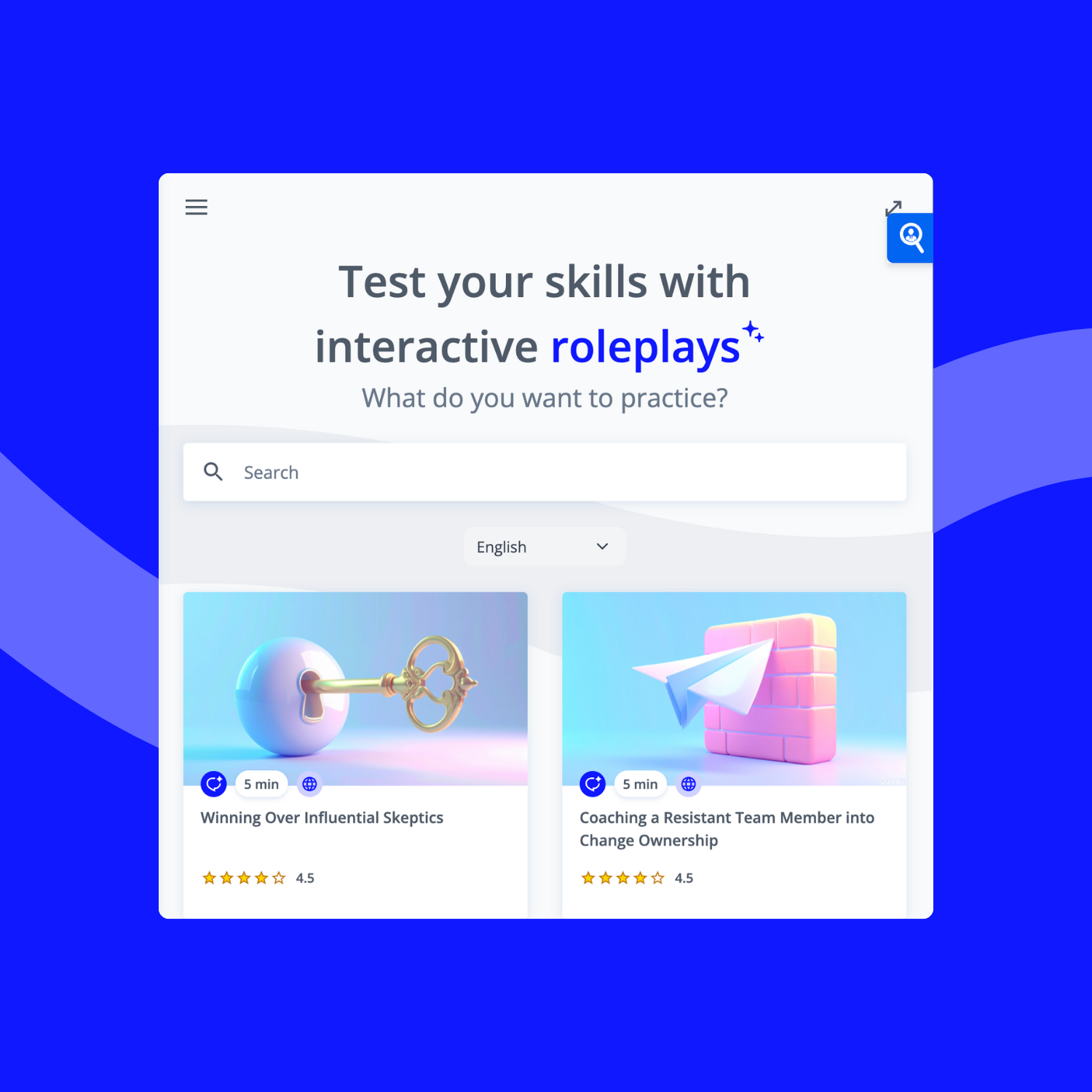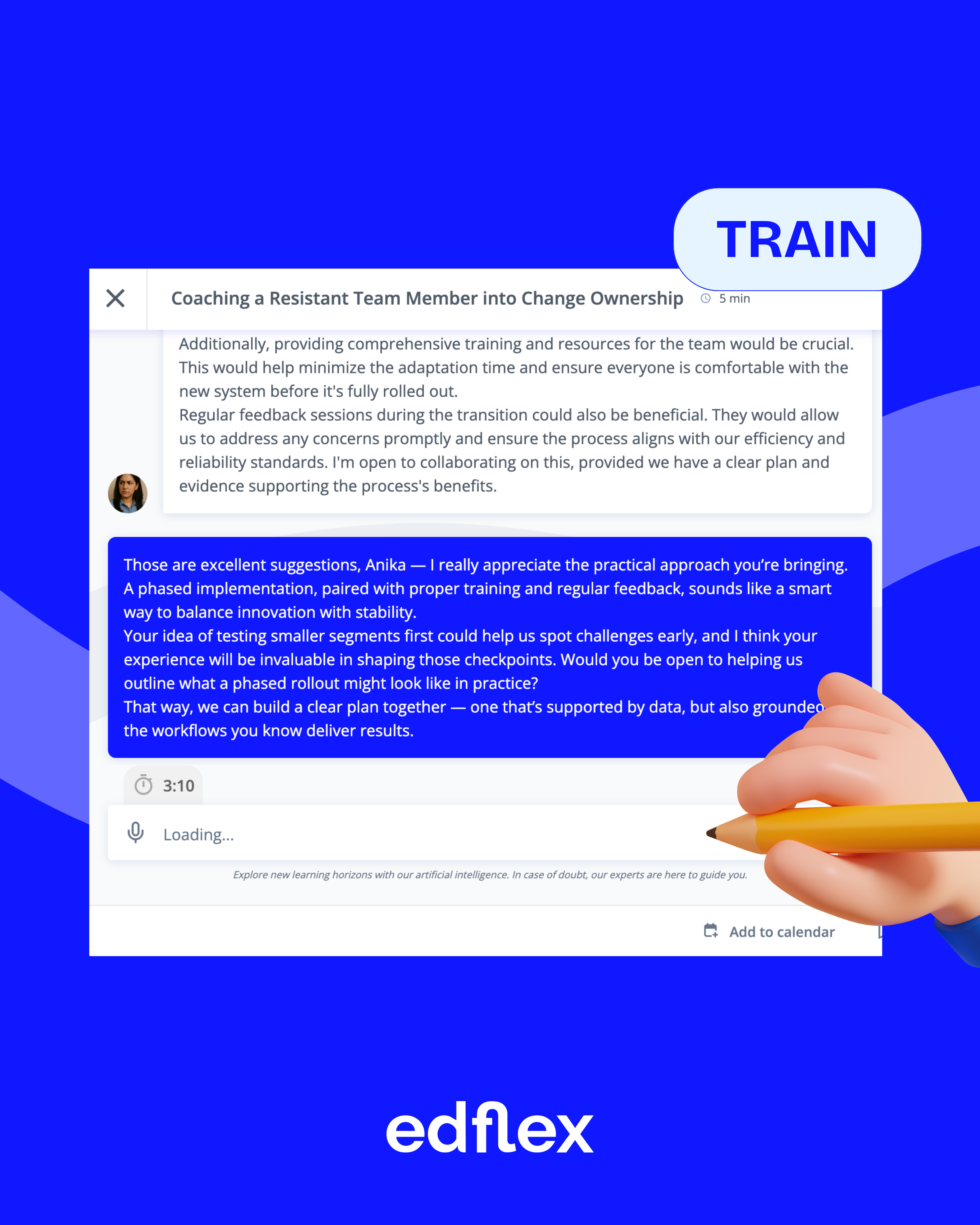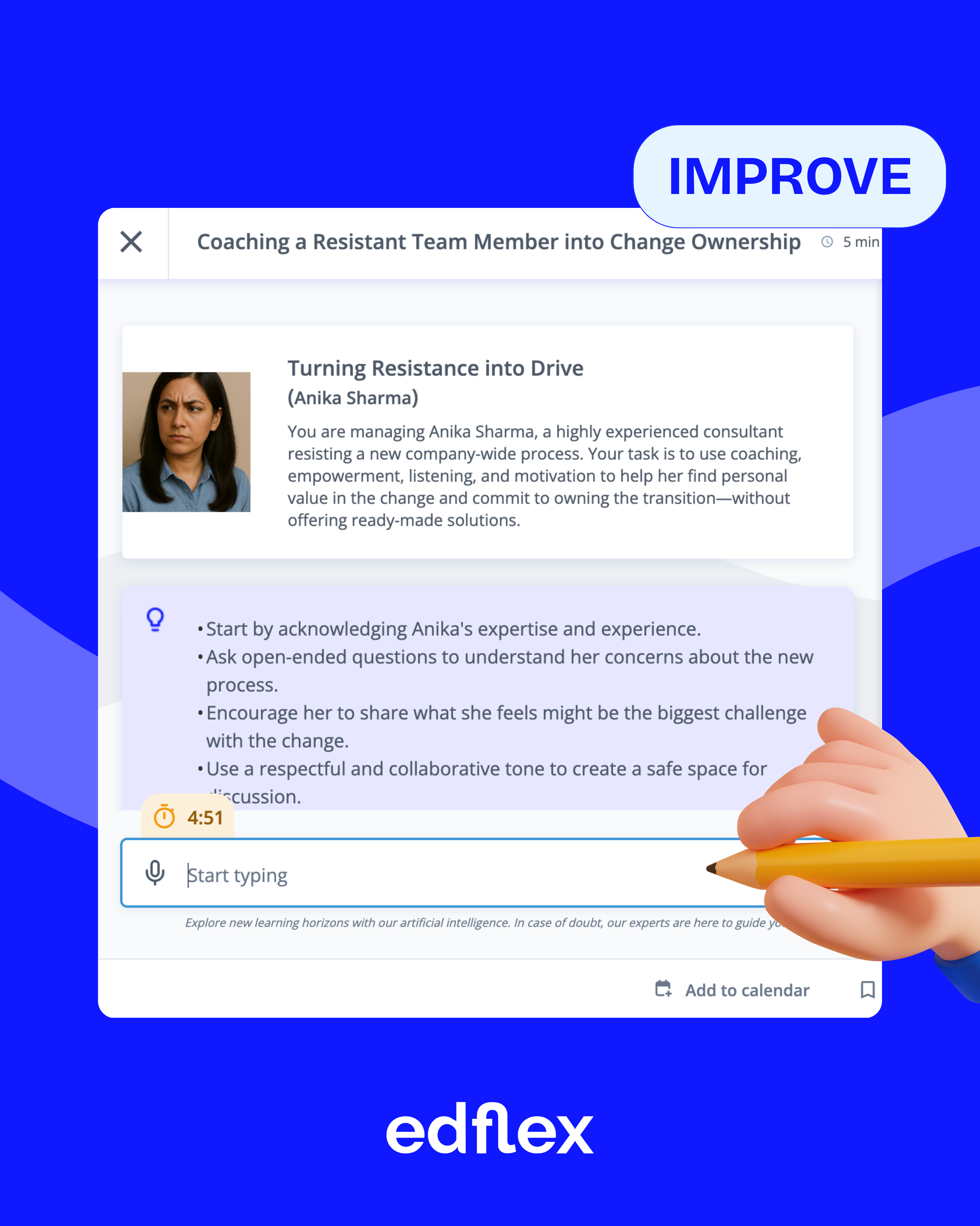 La théorie, c'est bien. La pratique, c'est mieux. Avec les roleplays Edflex, vos collaborateurs s'entraînent sur des situations professionnelles réelles et reçoivent un feedback instantané de notre IA. Résultat : chaque mise en pratique devient un véritable accélérateur de compétences.